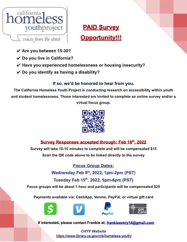 Sbcss Student Services On Twitter California Homeless Youth Project Is Seeking Participants To Complete Our Paid Online Survey And Or Virtual Focus Group To Help Us Research The Needs Of Students With Disabilities